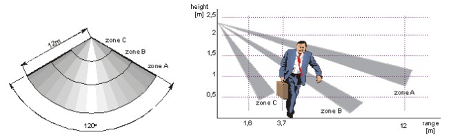 1、从图中的探测器的阴影区为一个探测区域,这样只有穿越探测区域时才会触发探测器,所以测试时,只有横切(穿越)探测区,探测器才会报警,否则,就会误认为该探测器的灵敏度低,结果擅自调高灵敏度,导致探测器频频误报。