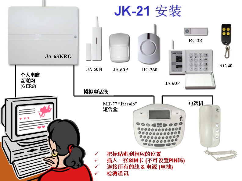 家庭安防系统利用主机,通过无线或有线连接各类探测器,实现防盗报警功能。主机连接固定电话线,如有警情,按照客户设定的手机或则电话号码拨号报警。