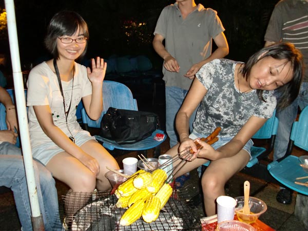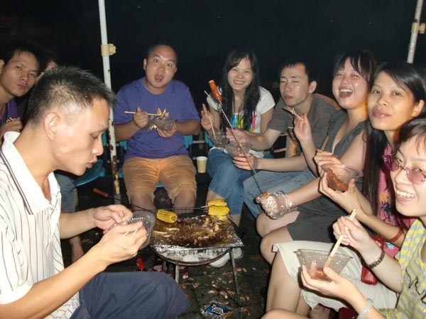 晚上的时候,我们就来到海边烧烤,我们分成了2组,第一组11个人,第二组呢是11+1,因为我们还有一位可爱的不到一岁的小朋友,我们同事的小宝宝。我们每个组都有一个很会弄烧烤的同事,尽心尽力,毫无怨言的为大家服务,我们吃烤鱼,烤虾,还有茄子,香菇等等等太多的美味了,大家都吃的很幸福,各个脸上满足的笑容就诠释了一切。天还下着小雨,为我们增添了不少乐趣。