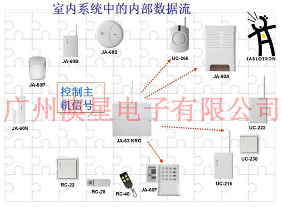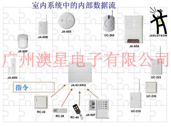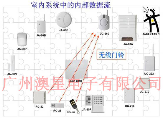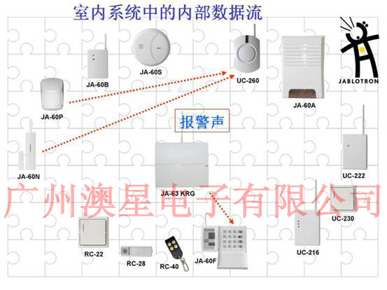由上图我们可以清楚的看出来捷豹无线报警系统的组成,首先有前端探头,当然包含了有线和无线的、报警主机、控制器和一些辅助输出设备等。前端探头负责探测入侵信号,一旦探头探测到入侵信号则把该信号传送到报警主机,报警主机接收到探头发过来的信号后判断系统是处于布防状态还是撤防状态,如果处于布防状态主机则驱动警号鸣叫(撤防则不理会),驱动键盘显示出报警区域部位,驱动拨号模块把报警信号传送到 110 报警中心等。