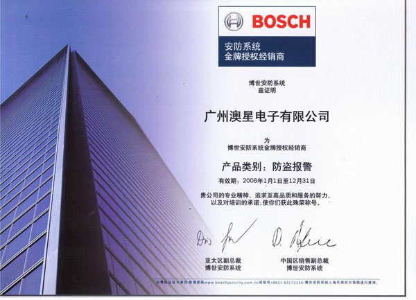 热烈庆祝继今年4月份广州澳星荣获博世2008年度忠诚合作奖之后,同在4月份广州澳星又荣获“博世”安防系统金牌经销商称号! 广州澳星于1996年就展开与“博世”安保公司的合作。“博世”的前身先后有澳大利亚EDM公司,美国迪信公司,荷立菲利浦公司。德国”博世“公司相继收购以上公 |