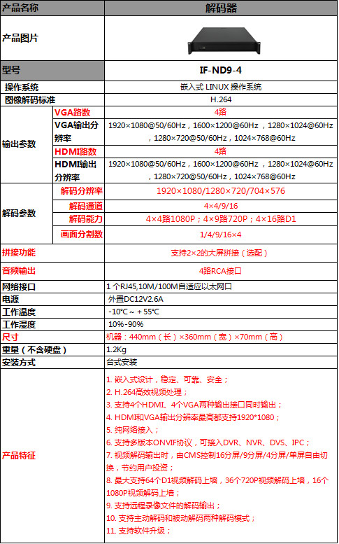 视频解码器是指一个能够对数字视频进行压缩或者解压缩的程序或者设备。今天给大家推荐一款,型号为IF-ND9-4的iFCS(爱弗)视频解码器,产品特征如下: