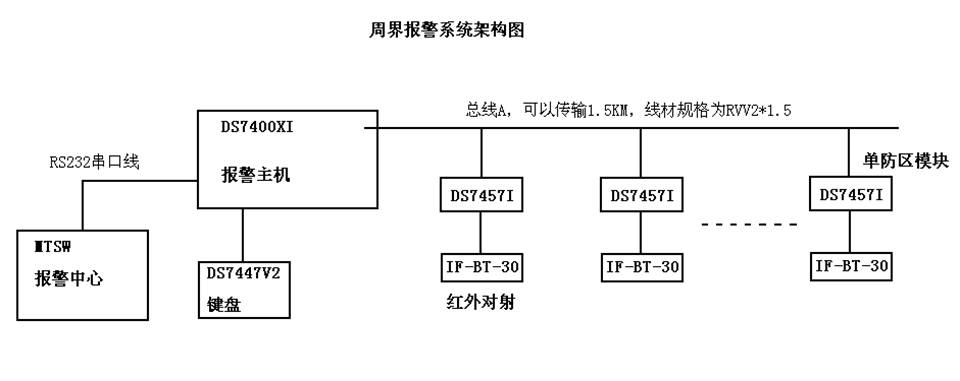 该系统采用了 BOSCH 公司的 DS7400XI 总线制报警主机,由于探测器分布较为分散复杂,所以主机和总线扩展模块( DS7457i )之间的信号传输要求较高,有距离限制,在本系统中可以采用 RVV4X1.5 ㎡信号线作为总线,在该种规格的线材下,单组总线信号可以传输 1.5 公里。