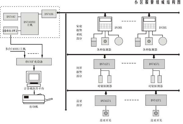家庭报警系统 : DS7400XI 报警主机平台。采用总线连接方式,配合 DS3MX/DS6MX 家用报警控制主机及专用管理接警软件 MTSW, 简单实用。